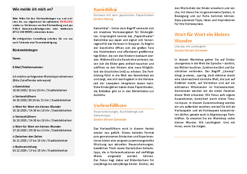 Es werden Ihnen Vertreter der Kinderbibliothek, des Jugendamts Stuttgart und des Staatlichen Schulamts über das Vorlesen in ihren Einrichtungen berichten, Ihnen Ihr mögliches Engagement aufzeigen und selbstverständlich Ihre Fragen beantworten.